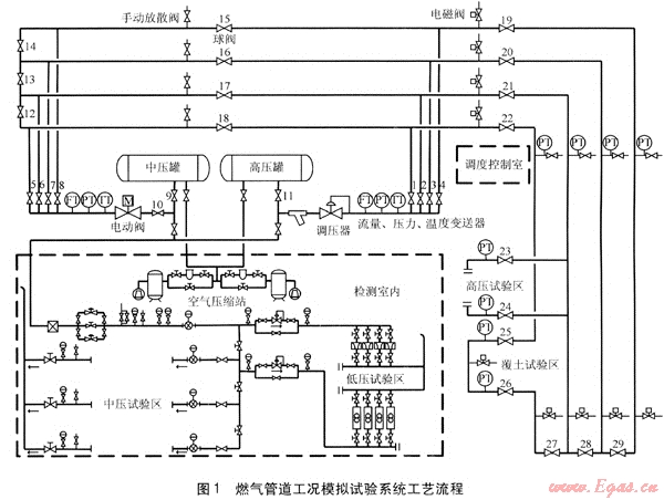 近幾年來,隨著供氣規(guī)模的日益擴(kuò)大,為保證安全、可靠供氣和燃?xì)庥行Ю?,燃?xì)夤芫W(wǎng)優(yōu)化調(diào)度問題受到了普遍重視。為實(shí)現(xiàn)燃?xì)夤芫W(wǎng)調(diào)度自動化,解決燃?xì)夤芫W(wǎng)系統(tǒng)工況優(yōu)化以及管道事故分析等問題,涌現(xiàn)出了許多監(jiān)督控制、數(shù)據(jù)采集、仿真模擬、泄漏分析與定位軟件。這些軟件運(yùn)行結(jié)果的準(zhǔn)確與否,直接影響管網(wǎng)系統(tǒng)的設(shè)計、投資和運(yùn)行的可靠性。由于燃?xì)夤芫W(wǎng)的特殊性,即使將軟件安裝在現(xiàn)場,也無法設(shè)置各種工況來檢驗軟件的可靠性,只能依靠軟件本身設(shè)定參數(shù)進(jìn)行前期虛擬調(diào)試,軟件計算的準(zhǔn)確度、能否適應(yīng)不同工況、能否對運(yùn)行中的突發(fā)事故做出正確響應(yīng)均無法得到有效驗證。本文介紹的燃?xì)夤艿拦r模擬試驗系統(tǒng)是在充分研究城鎮(zhèn)燃?xì)廨斉湎到y(tǒng)結(jié)構(gòu)的基礎(chǔ)上設(shè)計的,運(yùn)行環(huán)境接近實(shí)際,工況設(shè)定靈活,可以模擬事故,為燃?xì)鈶?yīng)用軟件提供現(xiàn)場測試平臺。