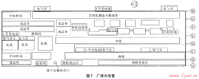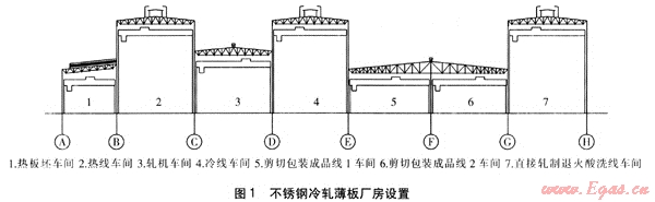不銹鋼冷軋薄板工程占地面積約14×104m2,廠房總長(zhǎng)度為690m,總寬度為204m,由相鄰的多跨車(chē)間組成??偨ㄖ娣e為12.861×104m2,其中熱板坯車(chē)間建筑面積為14490m2,該車(chē)間不供暖。其他車(chē)間建筑面積為11.412×104m2,為供暖區(qū)域。由于供暖區(qū)域內(nèi)包括磨輥間、變電站、成品庫(kù)等不需供暖的部位,因此為簡(jiǎn)化問(wèn)題,供暖面積按11×104m2考慮。不銹鋼冷軋薄板廠房設(shè)置及廠房?jī)?nèi)布置分別見(jiàn)圖1、2。