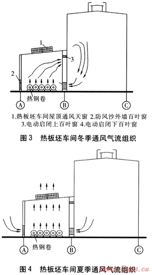 熱線、冷線、直接軋制退火酸洗線車(chē)間都有加熱爐存在,都會(huì)散發(fā)大量余熱,造成車(chē)間溫度的顯著上升。為此,上述車(chē)間都需要在加熱爐段設(shè)置通風(fēng)天窗。夏季通風(fēng)天窗全部開(kāi)啟排風(fēng),依靠的下部周邊窗戶自然進(jìn)風(fēng),消除余熱。冬季盡量關(guān)閉天窗,使熱氣流向下對(duì)流,不足熱負(fù)荷需考慮在車(chē)間的首尾段增設(shè)供暖設(shè)施。并考慮在高側(cè)墻設(shè)置軸流風(fēng)機(jī)強(qiáng)化通風(fēng)效果。