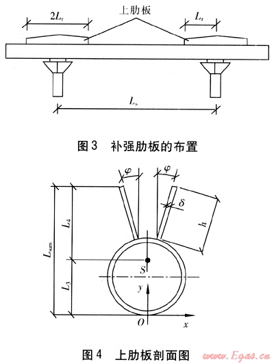 該方法通過增大管道截面系數(shù),使滑動支架跨距增加30%~60%[4],而多消耗的金屬不會超過管子重量的10%。當(dāng)滑動支架間距較長時,可以在滑動支架處管道上方加焊肋板,肋板可用扁鋼或鋼板制成,補(bǔ)強(qiáng)肋板的布置見圖3。圖中,Ls為兩個滑動支架之間的距離,單位為m;Lr為滑動支架支點(diǎn)距肋板最遠(yuǎn)端的距離,單位為m,取Lr=0.1Ls。上肋板剖面圖見圖4,圖中,φ為肋板與管子截面中心垂直線的夾角,單位為(°);δ為肋板厚度,單位為m;h為肋板高度,單位為m;點(diǎn)S為管道補(bǔ)強(qiáng)后的重心,點(diǎn)O為坐標(biāo)原點(diǎn);L3為點(diǎn)S、O間距離,單位為m;L4為點(diǎn)S距肋板上端的垂直距離,單位為m;Lsum為L3、L4之和,單位為m。圖4中兩側(cè)肋板軸線交于點(diǎn)S。