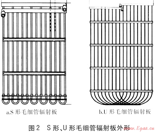 S形、U形毛細(xì)管輻射板外形見圖2。S形毛細(xì)管輻射板比較常用,它是由供回水主管和若干毛細(xì)管組成的。毛細(xì)管外徑為4.3mm,標(biāo)準(zhǔn)間距為20mm,還可以根據(jù)要求進(jìn)行調(diào)整。管材可采用無規(guī)共聚聚丙烯管(PP-R管)、耐熱聚乙烯管(PE-RT管)、聚丁烯管(PB管)。安裝方式有隱蔽式、半隱蔽式:隱蔽式是將毛細(xì)管輻射板安裝在圍護(hù)結(jié)構(gòu)內(nèi)部;半隱蔽式是將毛細(xì)管輻射板安裝在圍護(hù)結(jié)構(gòu)表面,采用裝飾物遮擋。