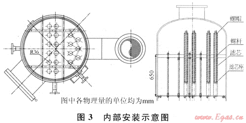 通過項(xiàng)目調(diào)研評估和可行性分析,決定拆除滌氣罐內(nèi)除沫網(wǎng),改裝19根高效過濾精度在0.05μm的頗爾纖維濾芯,方案經(jīng)過數(shù)次討論優(yōu)化,確定全部預(yù)制好到現(xiàn)場安裝,具體設(shè)計(jì)方案如圖2~4。