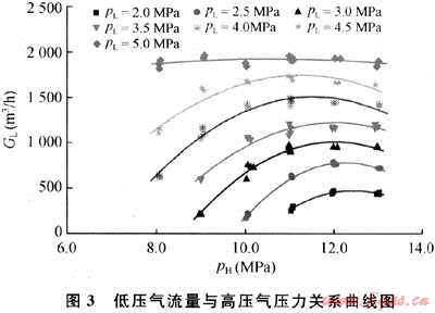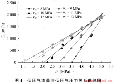 從圖3中可以看出,低壓氣流量與高壓氣壓力為非單調(diào)關(guān)系,隨高壓氣壓力的增大而先增大后減小。由該圖可知,當高壓氣壓力(pH)為11~12MPa時,低壓氣流量的變化規(guī)律發(fā)生轉(zhuǎn)變,這與裝置設(shè)計工作壓力有關(guān)。