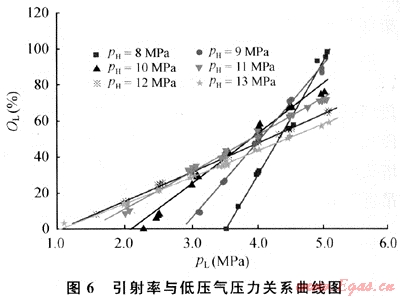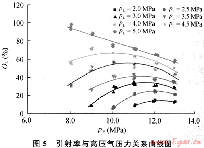 一般來說,隨著高壓氣壓力的增加,高壓氣流量增大,相應(yīng)的引射量(低壓氣流量)也增大。但當聲。高于某特定值時,隨著高壓氣壓力的進一步增大,噴嘴出口的壓力升高,低壓氣的進氣壓力與噴嘴出口壓力的壓差減小,從而低壓流體的引射量減少。這表明在天然氣噴射裝置實際運行時,不能靠盲目提高高壓氣的進氣壓力來增大低壓氣流量。