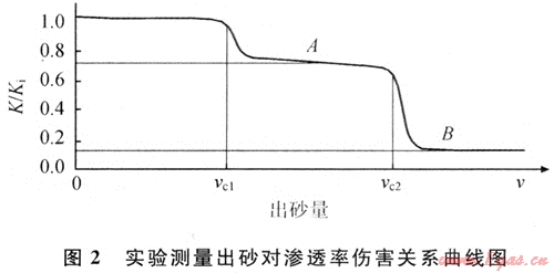 淺層氣藏地層容易出砂,在近井地層形成堆積并堵塞孔喉,造成近井地帶滲透率降低。圖2為實驗室?guī)r心實驗測量的出砂對滲透率傷害關系曲線。在巖石發(fā)生坍塌破壞之前,地層中游離砂產生的微粒運移傷害,造成儲層的相對滲透率降低了25%左右(圖2中A點)。隨著氣體流速的增加,受剪切應力的作用儲層骨架遭到破壞,近井地帶大量出砂。在游離砂和骨架砂的復合作用下,儲層的相對滲透率降低至儲層原始滲透率的20%左右(圖2中B點)[3~4]。