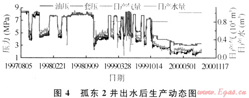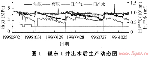 對于孤東淺層氣藏來說,底水錐進是一種常見的水侵方式。水錐初期對氣井產能的影響一般較微弱。隨著開采時間延長,水錐高度逐漸增加,水錐前沿到達近井地帶。此時射開層上部是氣體單相流,下部為氣水兩相流,近井地帶氣相相對滲透率值降低,氣井產能降低。開采后期水完全包圍近井地帶,氣井完全處于氣液兩相流狀態(tài),隨著近井地帶含水半徑和含水飽和度的增大,氣井產能急劇降低,嚴重情況下,氣井水淹封閉。典型井如孤東1井,圖1是該井出水后的生產動態(tài)。氣井產水后,生產中套壓、油壓同時下降,關井后套壓油壓重新恢復。氣井產水后期套壓波動的幅度逐漸增大,水錐加重了地層近井帶滲透狀況的劣化程度。