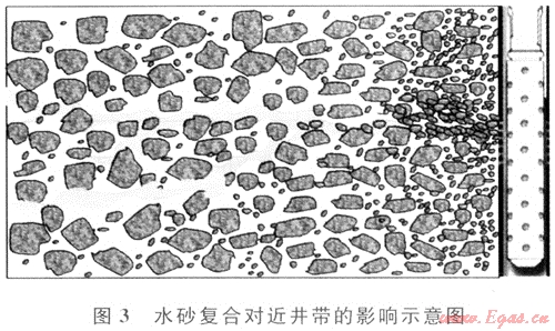 儲層中黏土礦物遇淡水極易膨脹和運移,膠結變差,儲層易出砂。水砂復合對滲流影響劇烈。在水砂復合傷害的情況下,氣藏的絕對滲透率和氣相相對滲透率降低同時降低。如果氣井間歇關井,則近井地帶氣液兩相重新分布,從開井生產時的氣液兩相同流變成液相為連續(xù)相,氣相呈氣泡狀分布在地層孔隙中。對出砂地層,在近井地層和防砂管之間一定范圍內會形成污染帶,其中地層中粉細砂及泥質在高含水飽和度成為非牛頓流體,重新開井時需要啟動壓力,在某些情況下會造成水淹氣藏(圖3)。