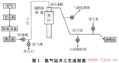 氮?dú)忏@井工藝技術(shù)流程是以氮?dú)鉃楣ぷ鹘橘|(zhì),使用空壓機(jī)對(duì)空氣先進(jìn)行輸氣,經(jīng)過(guò)制氮設(shè)備產(chǎn)生氮?dú)?,然后?jīng)過(guò)增壓機(jī)再增壓入井,最后完成攜帶巖屑和消除粉塵的任務(wù),具體流程見(jiàn)圖1。