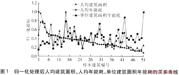 基于統(tǒng)計(jì)數(shù)據(jù)得到51幢樣本建筑的人均建筑面積、人均年能耗、單位建筑面積年能耗,為便于分析,對這3項(xiàng)數(shù)據(jù)進(jìn)行了歸一化處理。將51幢公共建筑按歸一化處理后的人均建筑面積由大到小進(jìn)行編號(hào),三者的關(guān)系曲線見圖1。由圖1可知,隨著人均建筑面積的增加,人均年能耗呈現(xiàn)上升的趨勢,而單位建筑面積年能耗呈現(xiàn)下降的趨勢。