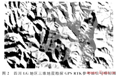 在GIS中利用數(shù)字高程模型,合理布設(shè)測量控制點(diǎn),提前進(jìn)行GPS基準(zhǔn)站的信號(hào)覆蓋情況模擬(圖2),并結(jié)合交通路線的分布情況,合理安排導(dǎo)線小組開始施測的位置,從而保證每個(gè)GPS施測小組在交通最方便的地方開始施測并能最大范圍地接收到來自GPS基準(zhǔn)站的GPS信號(hào)。如遇深溝或夾溝等信號(hào)盲區(qū),利用地形高差變化和交通情況,合理調(diào)配和架設(shè)中繼站,提高施測效率。