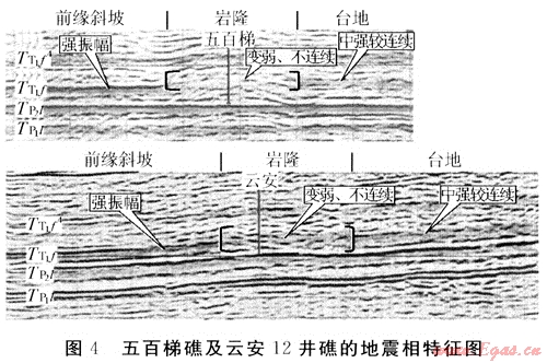 通過圖4五百梯礁以及云安12井礁等地震剖面分析,由圖4可見,對長興組生物礁識別方法歸納如下:①生物礁礁前至前緣斜坡-海槽相剖面段,長興組頂界反射能量明顯增強;且互相獨具有良好的連續(xù)性和光滑性,在生物礁礁后至臺地相,其反射層振幅雖較前緣斜坡,海槽相弱,但連續(xù)性明顯優(yōu)于生物礁(灘)段反射。正是由于其區(qū)域地震相特征,顯示并指示出生物礁(灘)發(fā)育的剖面具體位置。②臺緣生物礁均發(fā)育在前緣斜坡-臺地間的坡折處,常與海槽相平行,相帶相對狹窄。③礁前、礁后地震相(包括振幅、連續(xù)性等)屬性發(fā)生橫向突變現(xiàn)象。④礁體自身地震相(如反射外形、振幅、連續(xù)等屬性),由于局部沉積環(huán)境不同存在一定差異,但都具有反射絮亂,不連續(xù)的基本特征。⑤其分布完全與現(xiàn)今構(gòu)造的展布無關(guān)。需要指出的是,垂直臺地-海槽相帶的地震測線其預測可靠性相對更高。