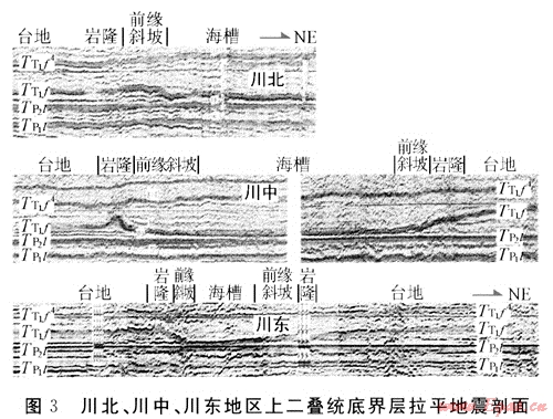 地震相是以反射波的頻率、振幅、相位、時差及反射外形等屬性來反映地層物性變化的。通過地震相研究表明,在眾多地震屬性中,反射振幅、層間時差和反射外形結(jié)構(gòu)(如平行、上超、下超、前積等)是識別四川盆地臺地-海槽沉積相的區(qū)域橫向變化較為實用的幾個屬性標志。
