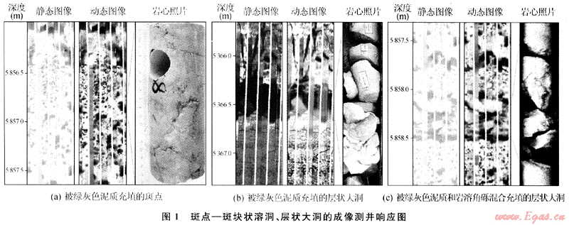 溶洞是碳酸鹽巖最重要的儲集空間類型之一,其成因復(fù)雜,分布的非均質(zhì)性強(qiáng)烈,預(yù)測難度很大[1]。前人多從露頭、巖心、常規(guī)測井及三維地震等資料的分析開展溶洞型碳酸鹽巖儲層的預(yù)測研究。筆者在巖心刻度和常規(guī)測井標(biāo)定基礎(chǔ)上,根據(jù)FMI、EMI電成像測井資料,研究了塔里木盆地輪古東地區(qū)奧陶系碳酸鹽巖儲層中溶洞的類型、特征及分布。