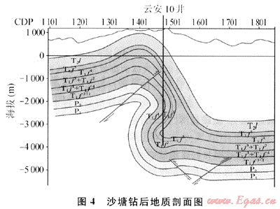 以云安10井為例,該井位于沙塘潛伏構(gòu)造西段近軸部,鉆探目的是了解潛伏構(gòu)造西高點(diǎn)的含流體性質(zhì),為該潛伏構(gòu)造的一口預(yù)探井。設(shè)計石炭系頂界海拔-4520m,預(yù)計井深5520m。實(shí)鉆鉆遇構(gòu)造陡帶。