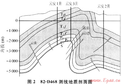 分析該井鉆探失利的原因:首先是構(gòu)造復(fù)雜;其次,構(gòu)造倒轉(zhuǎn)部位的回轉(zhuǎn)波與陡帶地震波相互交織,給構(gòu)造解釋帶來很大難度;第三,在地震同相軸追蹤上將飛仙關(guān)四段的“凹部”回轉(zhuǎn)反射認(rèn)為是下二疊統(tǒng)頂?shù)恼驑?gòu)造反射,將地層陡帶下部“凹部”處理成“斷壘”型構(gòu)造,從而導(dǎo)致勘探的失利。