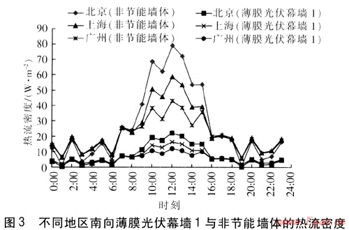 以北京、上海、廣州為例,北京θo,av,取28.6℃,θo,dr,取33.2℃;上海θo,av取30.4℃,θo,av取34℃;廣州θo,av取30.1℃,θo,dr取33.5℃。經(jīng)計(jì)算可得,不同地區(qū)南向薄膜光伏幕墻1與非節(jié)能墻體的熱流密度見圖3。由圖3可知,這3個(gè)地區(qū)墻體熱流密度最高值均出現(xiàn)在12:00左右。經(jīng)計(jì)算可得,對(duì)于這3個(gè)地區(qū),非節(jié)能墻體結(jié)合薄膜光伏組件后的節(jié)能率可達(dá)72%。