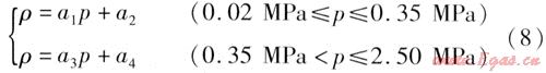 對(duì)于飽和蒸汽的熱力性質(zhì),國(guó)際水和蒸汽性質(zhì)協(xié)會(huì)(IAPWS)在1997年建議開(kāi)始使用新的水和蒸汽熱力性質(zhì)的IAPWS工業(yè)公式(簡(jiǎn)稱(chēng)為IAPWSIF97)[3],該公式是為了滿(mǎn)足動(dòng)力工業(yè)的需要而制定的,參數(shù)適用范圍大,表達(dá)式復(fù)雜。而常用供熱系統(tǒng)所用蒸汽壓力比動(dòng)力系統(tǒng)低得多,范圍也小得多,因此在供熱系統(tǒng)常用壓力范圍內(nèi)對(duì)狀態(tài)參數(shù)進(jìn)行擬合。考慮到工程應(yīng)用中以采用相對(duì)壓力為主,這里對(duì)相對(duì)壓力范圍0.02~2.50MPa的飽和蒸汽進(jìn)行擬合,得到密度與相對(duì)壓力的關(guān)系式: