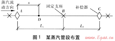 某蒸汽管段布置見圖1。長度為L1、L2的兩段直管段,設(shè)置3個固定支座和兩個波紋管補償器A、C。設(shè)暖管前鋼管溫度為θ1、暖管蒸汽溫度為θ2、管道單位長度質(zhì)量為ml。蒸汽由A端進入,流速為v。與直徑相比,鋼管的壁厚較小,且鋼材的熱導(dǎo)率較大,忽略管壁的溫升過程,即按蒸汽到達之處管壁溫度與蒸汽溫度相同考慮。當暖管蒸汽到達點A,并從點A繼續(xù)向前流動一段距離菇到達點D時,管段AD伸長量的計算式為: