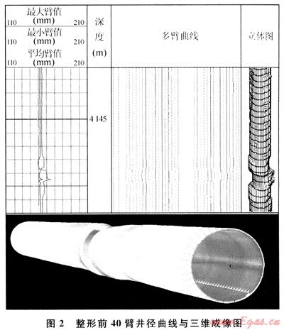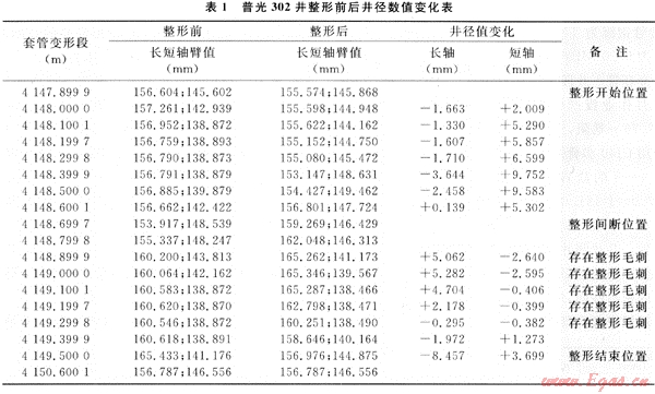 為了檢驗整形效果和了解整形后套管回彈情況,整形24h后用40臂井徑測井儀器復(fù)測,整形段套管內(nèi)徑變化對比見表1。從表1中可以看出,套管變形嚴重井段4148.0~4148.6m的長軸徑值縮短1.3~3.6mm;短軸徑值增加2~9.7mm,具有較明顯的整形效果;井段4148.9~4149.3m整形效果不理想,該處為套管接箍,分析存在套管整形毛刺。