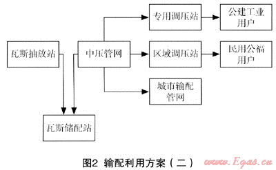 大中型煤礦瓦斯抽采一般分高低濃度兩套抽放系統(tǒng),這樣為高低濃度瓦斯的利用提供了有利條件。其中35%~45%高濃度瓦斯可以供應(yīng)礦區(qū)的民用、營業(yè)福利炊事、洗浴爐、燃?xì)忮仩t、熱風(fēng)爐、工業(yè)爐窯等的自用氣,同時將大量的剩余瓦斯接入城鎮(zhèn)儲配、輸配系統(tǒng),供應(yīng)城市各類燃?xì)庥脩粲脷?。輸配利用方案見圖2。