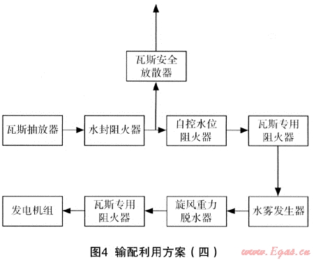 低濃度抽采系統(tǒng)安全性分析:低濃度瓦斯氣的抽采利用水環(huán)式真空泵的負(fù)壓進(jìn)行,系統(tǒng)隨著壓力的下降爆炸上限下降,在負(fù)壓下運行大大提高了抽采系統(tǒng)的安全性。水環(huán)式真空泵在輸送瓦斯的同時加入了霧狀的水分,加大了瓦斯氣的濕度,保證了該輸送環(huán)節(jié)的安全性。輸配利用方案見圖4。