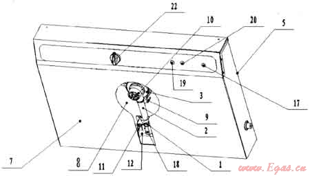 如圖1所示,在本具體實(shí)施例中,本研究項(xiàng)目立式家用燃?xì)庠畎ü鈾C(jī)構(gòu)、點(diǎn)火機(jī)構(gòu)、燃燒機(jī)構(gòu)以及可豎立擺放在櫥柜臺面或桌面4上或安裝在緊挨櫥柜臺面或桌面4的墻壁上的灶具主殼體5,此時(shí)灶具主殼體5的高度和寬度都明顯大于其厚度;所述供氣機(jī)構(gòu)包括進(jìn)氣管20、旋塞閥21和旋鈕22,所述進(jìn)氣管28與旋塞閥21相通,所述旋鈕22安裝在旋塞閥21上,所述旋塞閥21通過分氣管25及分氣管接頭26與連接件19連接相通;所述點(diǎn)火機(jī)構(gòu)包括脈;中點(diǎn)火器23和點(diǎn)火針24,所述脈沖點(diǎn)火器23與旋塞閥21連接相通并通過導(dǎo)線與點(diǎn)火針24連接,所述點(diǎn)火針24設(shè)置在爐頭3上;所述燃燒機(jī)構(gòu)包括噴嘴1、引射管2、爐頭3和鍋架9;所述噴嘴1的一端與連接件18連接相通,其另一端與引射管2的一端連接相通;所述引射管2的另一端與爐頭3連接并與爐頭3的火孔相通;所述爐頭3連接有鍋架9:所述灶具主殼體5的后殼面6上連接有轉(zhuǎn)軸固定架11,所述轉(zhuǎn)軸固定架11上設(shè)有一根與其相對轉(zhuǎn)動的轉(zhuǎn)軸12;所述燃燒機(jī)構(gòu)后端的連接件19與灶具主殼體5后殼面6的轉(zhuǎn)軸12連接;所述灶具主殼體5的前殼面7上設(shè)有供燃燒機(jī)構(gòu)在轉(zhuǎn)動過程中通過的孔8,如圖2所示;所述爐頭3底部連接有一個(gè)爐頭支撐架10。在本具體實(shí)施例中,本研究項(xiàng)目還在爐頭3邊安裝有熱電偶式熄火保護(hù)裝置27。