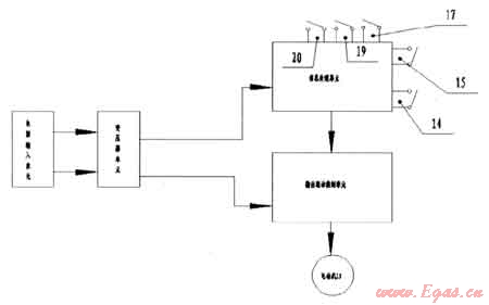 在本具體實(shí)施例中,如圖1和圖2所示,所述轉(zhuǎn)軸12的一端與設(shè)置在灶具主殼體5內(nèi)的電動機(jī)13的轉(zhuǎn)軸連接;所述轉(zhuǎn)軸固定架11上設(shè)有上限位開關(guān)14;所述燃燒機(jī)構(gòu)前端設(shè)有下限位開關(guān)15;所述電動機(jī)13、上限位開關(guān)14及下限位開關(guān)15均與控制電路板16電連接;所述控制電路板1 6 1-還電連接有電源輸入控制開關(guān)17、上升開關(guān)19及下降開關(guān)20。所述的電動機(jī)13、上限位開關(guān)14、下限位開關(guān)15、上升開關(guān)19、下降開關(guān)20以及控制電路板16組成一個(gè)可控制轉(zhuǎn)軸12轉(zhuǎn)動的轉(zhuǎn)軸自動轉(zhuǎn)動裝置。