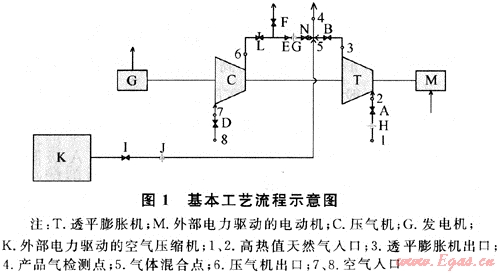 調(diào)壓站內(nèi)天然氣熱值自平衡技術(shù)基本工藝流程如圖1所示。它利用透平膨脹機(jī)代替?zhèn)鹘y(tǒng)調(diào)壓設(shè)備將高壓天然氣降壓[3],并將此過程的壓力能轉(zhuǎn)化成驅(qū)動能,帶動壓氣機(jī)生產(chǎn)壓縮空氣[4~5]摻混到已降壓的高熱值天然氣中,使調(diào)壓站出站天然氣熱值得以降低,其壓力等各項技術(shù)參數(shù)均與目標(biāo)值一致。一般情況下,此過程不需要外部動力驅(qū)動壓氣機(jī),而是回收利用“與生俱來”的天然氣壓力能。