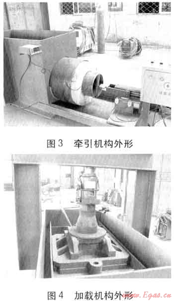 沙箱試驗機由沙箱、加載機構(gòu)、牽引機構(gòu)、電氣控制、測力傳感器、行程開關(guān)、計算機等部分組成。沙箱試驗機結(jié)構(gòu)見圖2,牽引機構(gòu)、加載機構(gòu)外形分別見圖3、4。牽引機構(gòu)由擺線針輪減速機、電動機、傳動部件等組成,牽引機構(gòu)通過測力傳感器與工作管相連。試驗時牽引機構(gòu)在行程開關(guān)的配合下使工作管作直線往復(fù)運動(每個行程100mm),測力傳感器通過顯示器顯示推力、拉力。沙箱試驗機可在空載、加載狀況下進(jìn)行操作,在進(jìn)行加載試驗時通過千斤頂對試件加載,加載力傳感器通過顯示器顯示加載力。由計算機計算空載時平均推(拉)力與加載時平均推(拉)力的比值。沙箱兩側(cè)焊接20號槽鋼,并焊接橫梁支撐,便于安裝千斤頂(見圖4)。沙箱底部設(shè)置與牽引機構(gòu)、電控及儀表箱相連的支座。