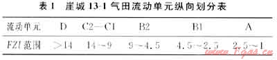 崖城13-1氣田評價的早期,采用傳統(tǒng)的一套氣藏統(tǒng)一測井處理參數(shù)的方法,沒有過多考慮氣藏縱向上測井巖石物理特性的變化,后來嘗試分巖相建立測井解釋模型,但是采用常規(guī)測井資料劃分出的巖相較粗,而井點巖相變化較復雜,按照巖相建立確定性模型比較困難,而且誤差較大,可能出現(xiàn)氣田動、靜態(tài)儲量評價的較大差異;認識到這些問題后,研究人員開始轉(zhuǎn)向?qū)⑦@一整裝氣田按流動單元的思想來進行精細剖析。按照前述方法,對于陵三段儲層,通過研究巖石孔隙結(jié)構(gòu)特征,按照孔隙類型、孔喉分布以及表征巖石孔隙結(jié)構(gòu)的流動帶指標FZI劃分了6個流動單元,而其中有些流動單元只存在壓力差異而與測井評價相關(guān)的巖石