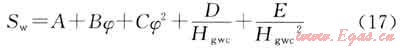 6) 利用測井所得的孔隙度和氣水界面高度,根據(jù)低侵巖心分析的含水飽和度和孔隙度采用二項式回歸公式計算,氣水過渡帶盡管沒有巖心含水飽和度,但是通過利用巖心毛細管壓力資料建立J函數(shù)飽和度模型后可以獲取過渡帶飽和度數(shù)據(jù),因此綜合油基鉆井液密閉心飽和度及毛細管壓力飽和度資料建模,可同時兼顧氣藏主體高部位及過渡帶,其模型如下: