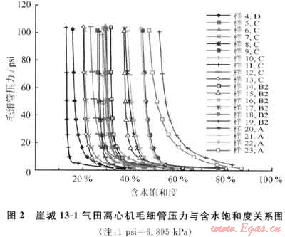 氣田采用低侵巖心Dean-Stark技術(shù)提取的巖心原始地層水礦化度比從Y4井水層測試產(chǎn)的水要淡,這使得在測井解釋中使用的礦化度是否正確成為一個重要問題。此外,嚴重的鉆井液侵入(探井)及大量巖心測量的電阻率參數(shù)也存在較大差異。這些不確定因素導致在利用模型1)計算含水飽和度時存在許多爭議性的問題,而且該模型無法直接應用到地質(zhì)建模及油藏數(shù)字模擬,因此需要建立一個非電法飽和度模型。氣田A1、A2開發(fā)井全井段油基鉆井液密閉心飽和度資料及一定的毛細管壓力實驗資料為這類模型的研究提供了基礎(chǔ)。但同時又出現(xiàn)了另一個問題,即所有開發(fā)井巖心分析含水飽和度都是束縛水飽和度,因為它們都高于氣水界面,因此在建立非電法模型時需要考慮這些因素。