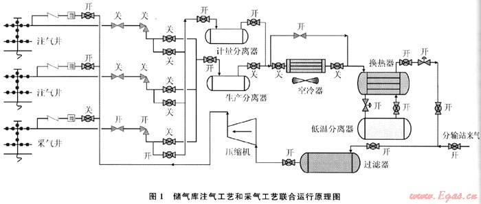 上游天然氣在分輸站調(diào)壓、計(jì)量后輸至儲(chǔ)氣庫集注站。進(jìn)站天然氣經(jīng)過濾器除去粉塵和雜質(zhì),經(jīng)壓縮機(jī)組增壓至13.O0~30.OOMPa,冷卻至溫度低于70℃后通過注氣匯管輸至井場(chǎng)注氣閥組,單井計(jì)量后再注入儲(chǔ)氣庫氣藏[1]。