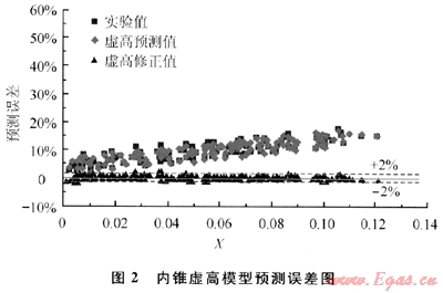 圖2為內(nèi)錐節(jié)流裝置虛高模型預(yù)測誤差圖,圖3為文丘里節(jié)流裝置虛高模型預(yù)測誤差圖,兩節(jié)流裝置虛高模型的虛高修正誤差在±1%以內(nèi)。