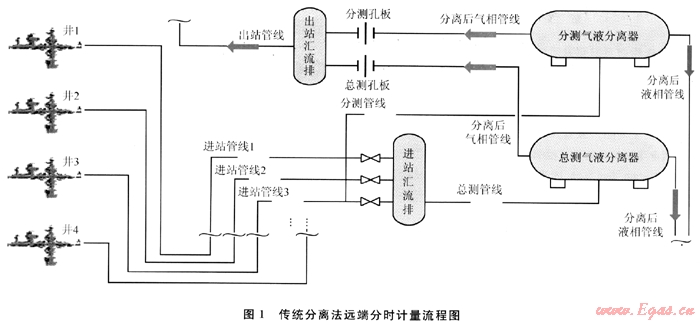 目前,我國井口天然氣計(jì)量現(xiàn)狀主要有以下3種情況:①利用分離法遠(yuǎn)端分時(shí)計(jì)量;②傳統(tǒng)的單相測量儀表計(jì)量;③根本不計(jì)量。傳統(tǒng)的分離法計(jì)量是將若干個(gè)氣井產(chǎn)物分別采用獨(dú)立管線集中輸送到遠(yuǎn)端中心集氣站,由集氣站內(nèi)的氣液分離設(shè)備對(duì)分離后的氣液兩相分別進(jìn)行計(jì)量,其流程如圖1所示,通過對(duì)進(jìn)站閥組流程的切換實(shí)現(xiàn)遠(yuǎn)端天然氣氣井的流量分時(shí)測量。這種方法存在流程復(fù)雜、占地廣、設(shè)備龐大、成本高、需要獨(dú)立敷設(shè)輸送管線和不能實(shí)現(xiàn)對(duì)每口井實(shí)時(shí)計(jì)量等問題。