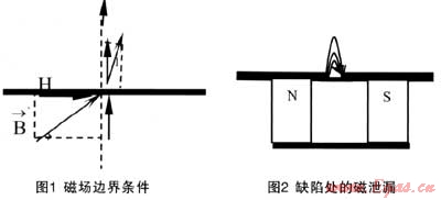 由上述理論可導(dǎo)出,當(dāng)磁場由磁導(dǎo)率大的介質(zhì)穿出到磁導(dǎo)率小的介質(zhì)中時,磁場向法向發(fā)生偏轉(zhuǎn)。因此當(dāng)磁場在管壁上遇到缺陷時由于μ2遠(yuǎn)小于μ1。使得磁場在缺陷出溢出形成漏磁信號。