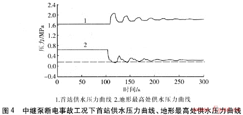 由圖4可知,首站循環(huán)泵出口壓力波動較大,最高達(dá)到2.05MPa,這比采用靜態(tài)水力分析的結(jié)果高約0.5MPa。在中繼泵斷電事故工況下,出現(xiàn)了地形最高處供水壓力低于飽和蒸汽壓力的情況,此時供熱介質(zhì)將發(fā)生汽化,易發(fā)生水擊事故。