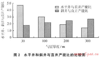 。水平井開(kāi)發(fā)油氣藏要求兩個(gè)基本的適用條件:①油氣層不能太厚;②垂向滲透率不能太低。 綜合分析氣井的物性參數(shù),建立不同井型的投入產(chǎn)出計(jì)算模型,明確不同井型的開(kāi)采效果。圖2是采用普光氣田實(shí)際儲(chǔ)層參數(shù)計(jì)算的不同厚度氣層條件下斜井和水平井同直井的產(chǎn)能比,這里斜井井斜角取75°,水平井水平段長(zhǎng)度取600m,氣層垂向滲透率與水平滲透率之比取0.5。從圖2中可看出,對(duì)有效厚度小于100m的氣層,水平井相對(duì)直井的增產(chǎn)效果明顯好于大斜度井,其增產(chǎn)倍數(shù)是斜井的2倍。但對(duì)于有效厚度大于200m的氣層,大斜度井的開(kāi)發(fā)效果好于水平井。