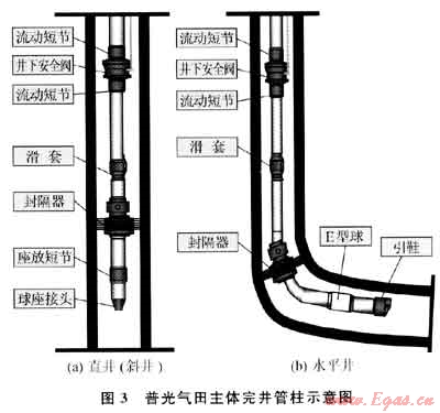 針對(duì)氣田硫化氫分壓高、生產(chǎn)井段長(zhǎng)及儲(chǔ)層非均質(zhì)性強(qiáng)的特點(diǎn),模擬普光氣田的工況條件,進(jìn)行不同材質(zhì)腐蝕評(píng)價(jià)實(shí)驗(yàn),優(yōu)化設(shè)計(jì)配套了生產(chǎn)完井一體化管柱(圖3),進(jìn)行雙向雙效、多級(jí)壓力延時(shí)起爆技術(shù)攻關(guān),開展抗硫耐溫酸液體系、多級(jí)注入+閉合酸壓及暫堵工藝研究,有效地改造了Ⅱ、Ⅲ類儲(chǔ)層,提高了氣藏的動(dòng)用程度和單井產(chǎn)能[8]。