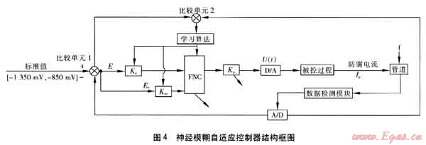 圖4中,F(xiàn)NC表示神經(jīng)模糊自適應(yīng)控制器,A/D表示模數(shù)轉(zhuǎn)換器,D/A表示數(shù)模轉(zhuǎn)換器,Ke表示偏差系數(shù),Kec表示偏差變化率系數(shù),E表示偏差,Ec表示偏差變化率,Ku表示防腐調(diào)整系數(shù),Ip表示實(shí)際防腐電流,f表示干擾信號(hào)。干擾信號(hào)f來源于大地磁場(chǎng)的波動(dòng)、土壤的濕度和松緊度變化、季節(jié)的變更以及野外強(qiáng)電電位突變等。干擾信號(hào)的出現(xiàn),將影響鋼質(zhì)管道管地電位的檢測(cè)值且改變管道的腐蝕狀況。