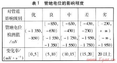 通過實(shí)驗(yàn)研究可知,對(duì)于管地電位檢測(cè)值U,不同的區(qū)間對(duì)管道的腐蝕影響不一樣。當(dāng)管地電位從-850mV向正的方向偏移時(shí),管道被腐蝕;當(dāng)管地電位從-1350mV向負(fù)的方向偏移時(shí),在陰極區(qū)將發(fā)生析氫反應(yīng),對(duì)管道的防腐涂層起剝離作用;在區(qū)間(-1350mV,-850mV)時(shí)管地電位達(dá)到國(guó)家標(biāo)準(zhǔn),此時(shí)管道的腐蝕影響為最小,對(duì)防腐涂層的影響作用也最小,定義此區(qū)間的管地電位值為優(yōu);在(-850mV,-630mV)區(qū)間,管道有輕微的腐蝕作用;在(-1550mV,-1350mV)區(qū)間,管道的陰極區(qū)將發(fā)生析氫反應(yīng),對(duì)管道防腐涂層有輕微的剝離作用,此時(shí)定義管道的腐蝕影響是良。如此類推,管地電位全部的區(qū)間影響程度見表1。
