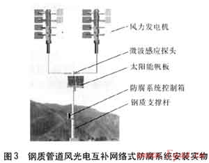 為操作簡(jiǎn)單化和防止人為破壞,每臺(tái)鋼質(zhì)管道風(fēng)光電互補(bǔ)網(wǎng)絡(luò)式防腐系統(tǒng)安裝在高度為7m的鋼質(zhì)支撐桿上,距地面不得低于5m,其安裝實(shí)物用見圖3。