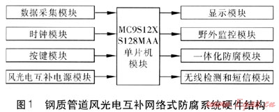 為了實(shí)現(xiàn)系統(tǒng)各部分功能,設(shè)計(jì)一個(gè)以單片機(jī)為核心控制模塊的防腐系統(tǒng),分為9個(gè)功能模塊,分別為單片機(jī)模塊、數(shù)據(jù)采集模塊、野外監(jiān)控模塊、顯示模塊、一體化防腐模塊、無線檢測(cè)和短信模塊、風(fēng)光電互補(bǔ)電源模塊、時(shí)鐘模塊、按鍵模塊。系統(tǒng)硬件結(jié)構(gòu)見圖1。