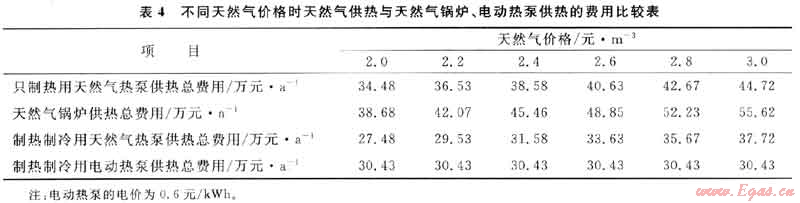 設天然氣鍋爐熱效率為85%,初投資約為40萬元。設備折舊費用按設備費的10年平均折舊計算,維修與管理費用按設備折舊費的20%計。天然氣鍋爐的效率比天然氣熱泵的供熱效率低,而且只有供熱的功能。在供熱量相同和天然氣價格不同時,只用于供熱的天然氣熱泵與天然氣鍋爐供熱費用的比較見表4。由表4可以看出,天然氣鍋爐供熱的總費用比天然氣熱泵單供熱的費用高,天然氣價格越高,二者之差越大,說明天然氣熱泵的效益更顯著。