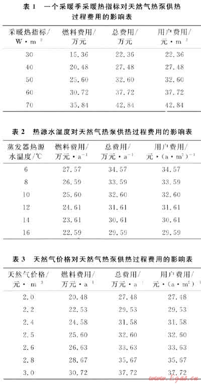 基本條件中,只有采暖熱指標變化對天然氣熱泵供熱費用的影響見表1;只有熱源水溫度變化對費用的影響見表2;只有天然氣價格變化對費用的影響見表3。由表可知,天然氣熱泵供熱費以燃料費用為主,降低采暖費用的主要措施是提高燃料的利用效率。
