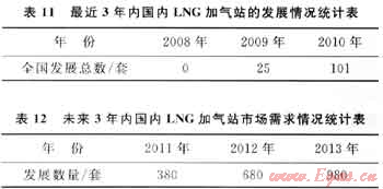 對(duì)LNG燃料汽車(chē)發(fā)展進(jìn)度影響最大的是配套LNG加氣站的建設(shè)。目前,我國(guó)3大能源企業(yè)(中石油、中石化、中海油)及新疆廣匯、新奧燃?xì)?、中?guó)港華燃?xì)?、華潤(rùn)燃?xì)獾纫慌鞠嗬^進(jìn)入了LNG替代汽柴油用于新能源汽車(chē)的研究領(lǐng)域,并相應(yīng)作出了3~5年建設(shè)LNG汽車(chē)加氣站、生產(chǎn)LNG公交汽車(chē)和重型卡車(chē)的規(guī)劃。表11、12分別是最近3年內(nèi)國(guó)內(nèi)LNG加氣站的發(fā)展情況及未來(lái)3年的市場(chǎng)需求情況統(tǒng)計(jì)[5]。