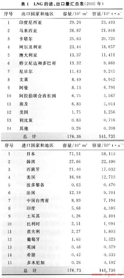 2003年全球天然氣消費(fèi)量為2.6×1012m3/a,至2006年持續(xù)以1.8%的比例增加,其后又以每年2.8%的比例增長(zhǎng),預(yù)計(jì)2025年全球天然氣消費(fèi)量將達(dá)5.1×1012m3/a。在天然氣貿(mào)易量中有7%是通過(guò)LNG的方式來(lái)進(jìn)行的,表1反映了世界LNG進(jìn)出口國(guó)家和地區(qū)的進(jìn)出口量[1]。