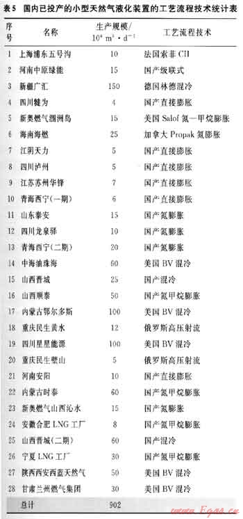 我國(guó)已建成投產(chǎn)的LNG工廠中,一部分采用了國(guó)外的流程工藝技術(shù),如美國(guó)的B&V、Salof、ACPI,法國(guó)的Sole,德國(guó)的Linde等;另一部分則采用了國(guó)內(nèi)自行開(kāi)發(fā)的技術(shù),如河南中原綠能高科有限責(zé)任公司、成都深冷空分設(shè)備工程有限公司、中國(guó)科學(xué)院理化技術(shù)研究所等的流程工藝。目前,國(guó)產(chǎn)液化工藝包日趨成熟,單條生產(chǎn)線的規(guī)??蛇_(dá)60×104m3/d(LNG年產(chǎn)量為16×104t)。國(guó)內(nèi)已投產(chǎn)的小型天然氣液化裝置的工藝流程技術(shù)統(tǒng)計(jì)情況如表5所示[4]。