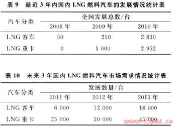 近年來(lái),我國(guó)LNG燃料汽車(chē)已進(jìn)入了快速發(fā)展通道,在短短的3年時(shí)間內(nèi),國(guó)內(nèi)已經(jīng)有新疆、山西、內(nèi)蒙古等地的LNG重型卡車(chē)及北京、杭州、深圳、烏魯木齊、昆明、海口、湛江、張家口等城市LNG公交相繼投入了運(yùn)行,而且這一城市群體還在迅速擴(kuò)大,充分說(shuō)明了LNG燃料汽車(chē)的技術(shù)已經(jīng)完全成熟、節(jié)能減排優(yōu)勢(shì)明顯。表9、10分別反映了最近3年內(nèi)國(guó)內(nèi)LNG燃料汽車(chē)的發(fā)展情況及未來(lái)3年汽車(chē)市場(chǎng)需求情況[5]。