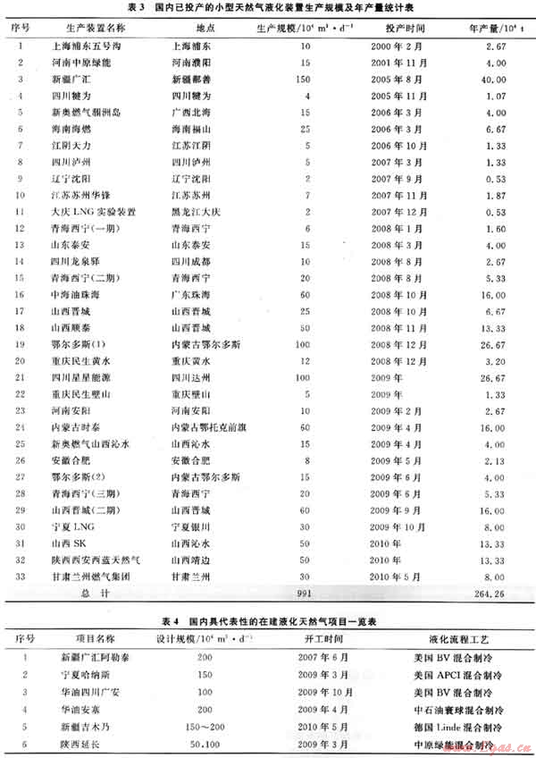 近年來(lái)我國(guó)小型LNG工廠發(fā)展迅速,截止到2010年1月,我國(guó)已經(jīng)運(yùn)營(yíng)的小型LNG裝置有30多座。這些小型LNG工廠分布在新疆、四川、江蘇、山東、山西、廣東、內(nèi)蒙古等省區(qū),總規(guī)模近1000×104m3/d,年產(chǎn)量超過(guò)260×104t。國(guó)內(nèi)I.NG工廠一覽表如表3、4所示[4]。